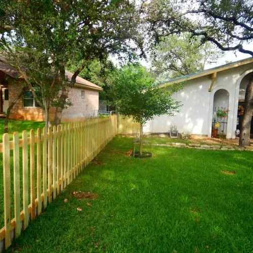 In the front of the house we did a 4' staggering fence per the specifications of the neighborhood association. In the back of the yard we did 6' solid picket run. We also installed side fences and gates. Along the complete bottom stretch of fence, going from front to back, we installed flat cinder blocks (mortared and supported by rebar to help redirect rain water runoff towards the back of the property).