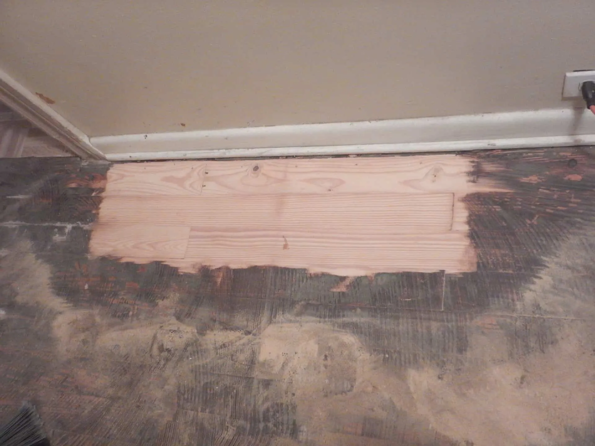 After the completion of the kitchen cabinets, Mrs. Williams asked Custom Texas Living to look at her hallway floor. On the floor had been linoleum tile glued down. After removing the linoleum, a thick black residue was left behind.